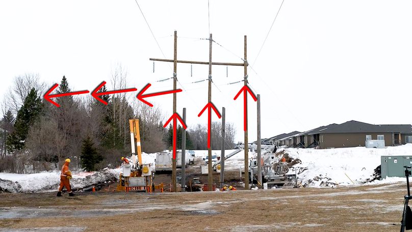 This dead-end structure was being replaced as part of our Integrated Pole Maintenance program — a cataloguing, maintenance, and refurbishment program for the wood poles that hold up power lines across the province. Before the implosion sleeves were brought in, the landscaping and grading around the structure was corrected for better water flow, new poles were set next to the old ones, and the old poles were sawed apart bit-by-bit to get them out of the way. Once the old poles are small enough, the line can be attached to the new poles. And then it’s detonation time.