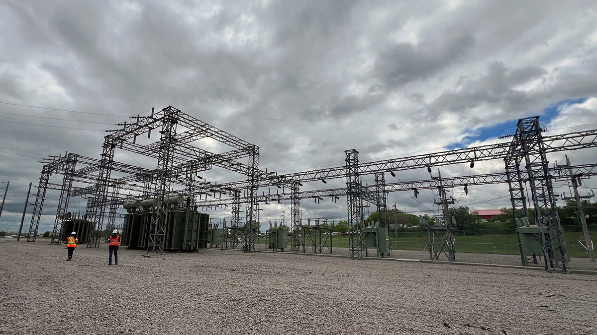 Enlarge image: Two workers in high-visibility and hard hats walk near substation equipment.