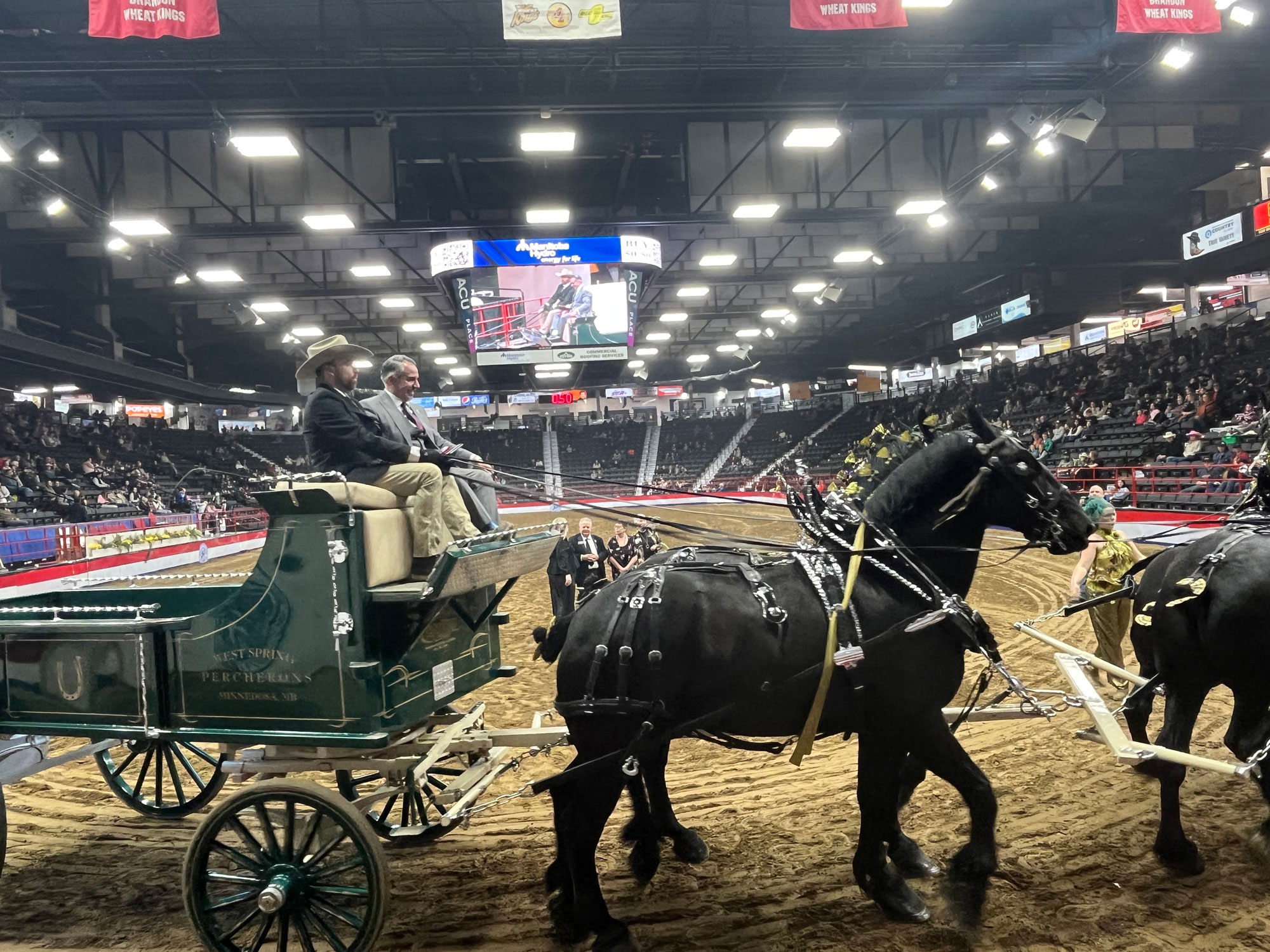 Enlarge image: Two people on a wagon pulled by black horses inside an arena.