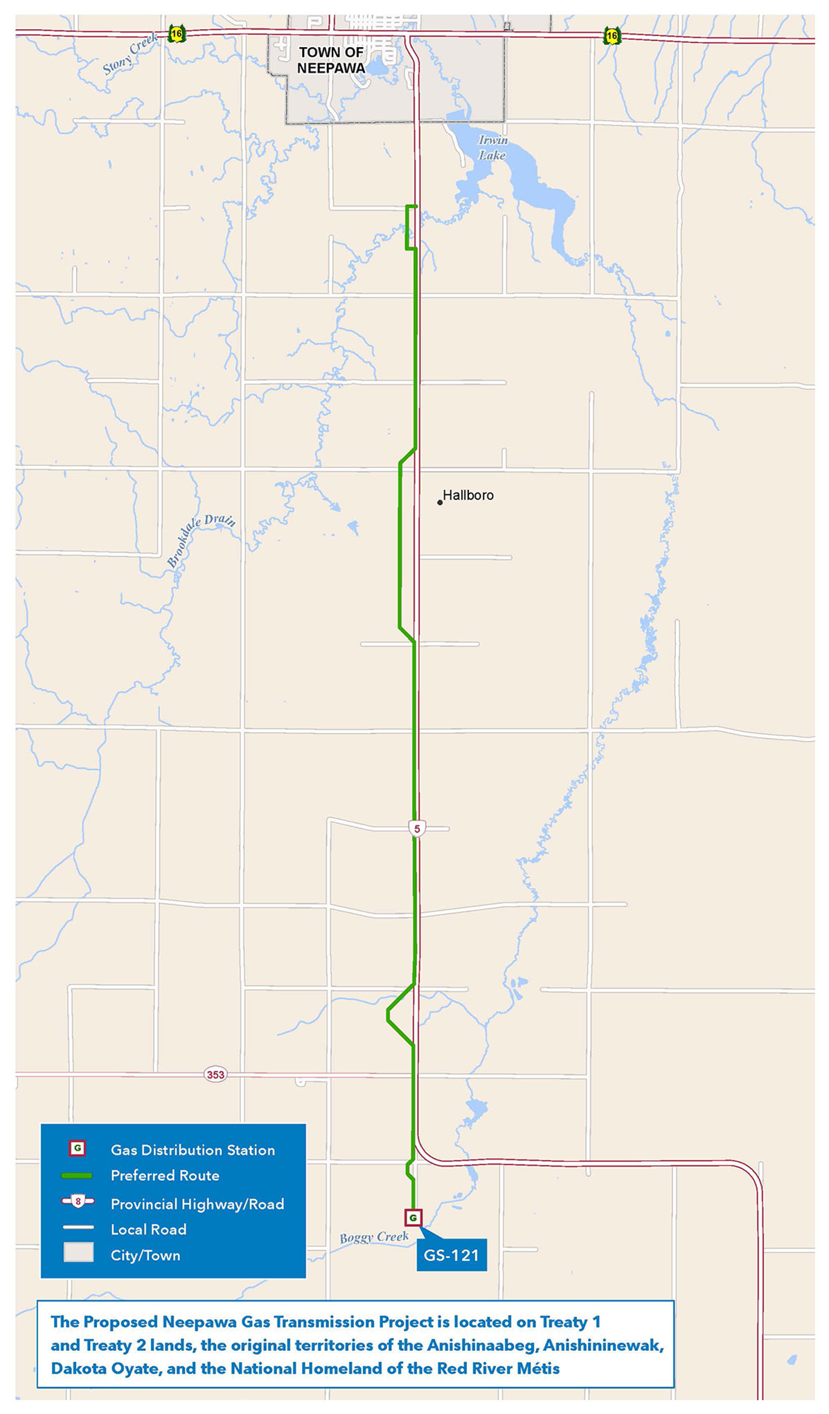 The preferred route for the Neepawa gas transmission pipeline (solid green line).
