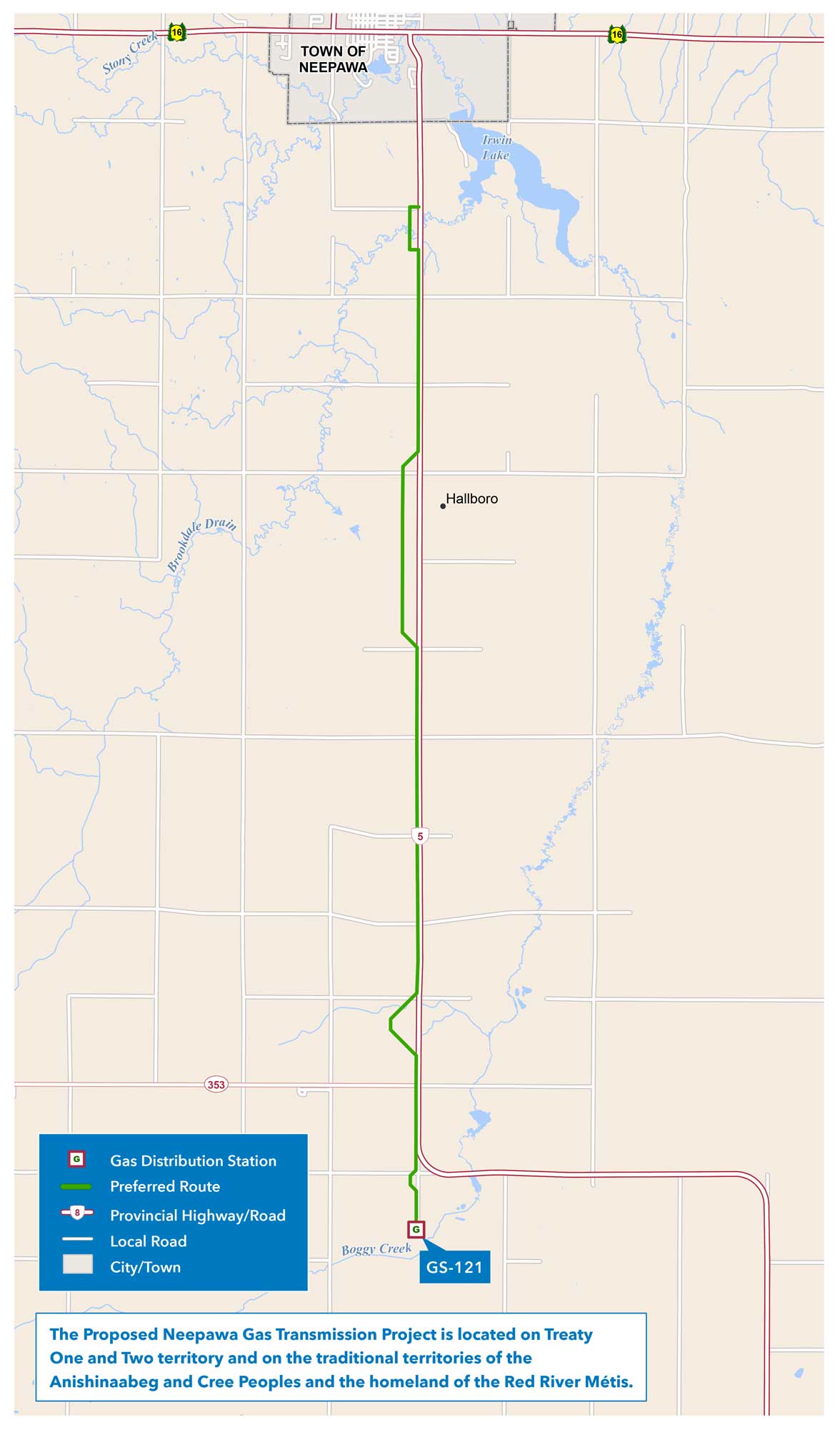 Le pipeline proposé traverse la municipalité rurale de North Cypress-Langford au sud de la ville de Neepawa et se situe sur les terres des Traités no 1 et no 2, les territoires originaux des Anishinaabeg, des Anishininewak et des Ininewak ainsi que sur la patrie des Métis de la rivière Rouge. Nous reconnaissons ces nations qui ont occupé ces terres et en ont pris soin pendant des milliers d’années ainsi qu’elles ont des liens culturels et spirituels de longue date avec la terre. Nous reconnaissons ainsi l’importance d’apprendre les perspectives uniques que ces nations partagent et de les prendre en compte tout au long du projet.